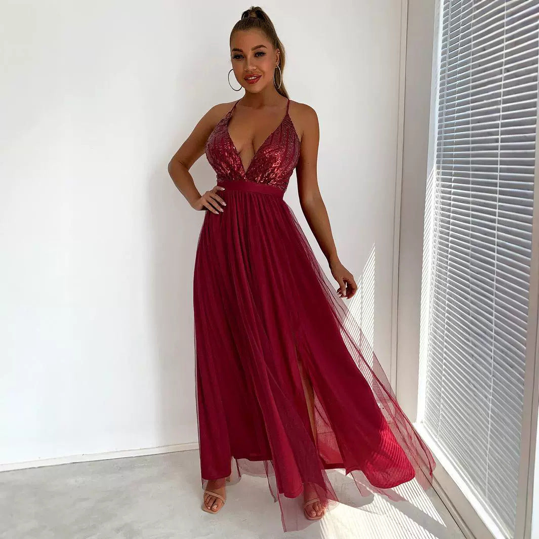 V-neck Brace Mesh Split Sleeveless Women's Dress